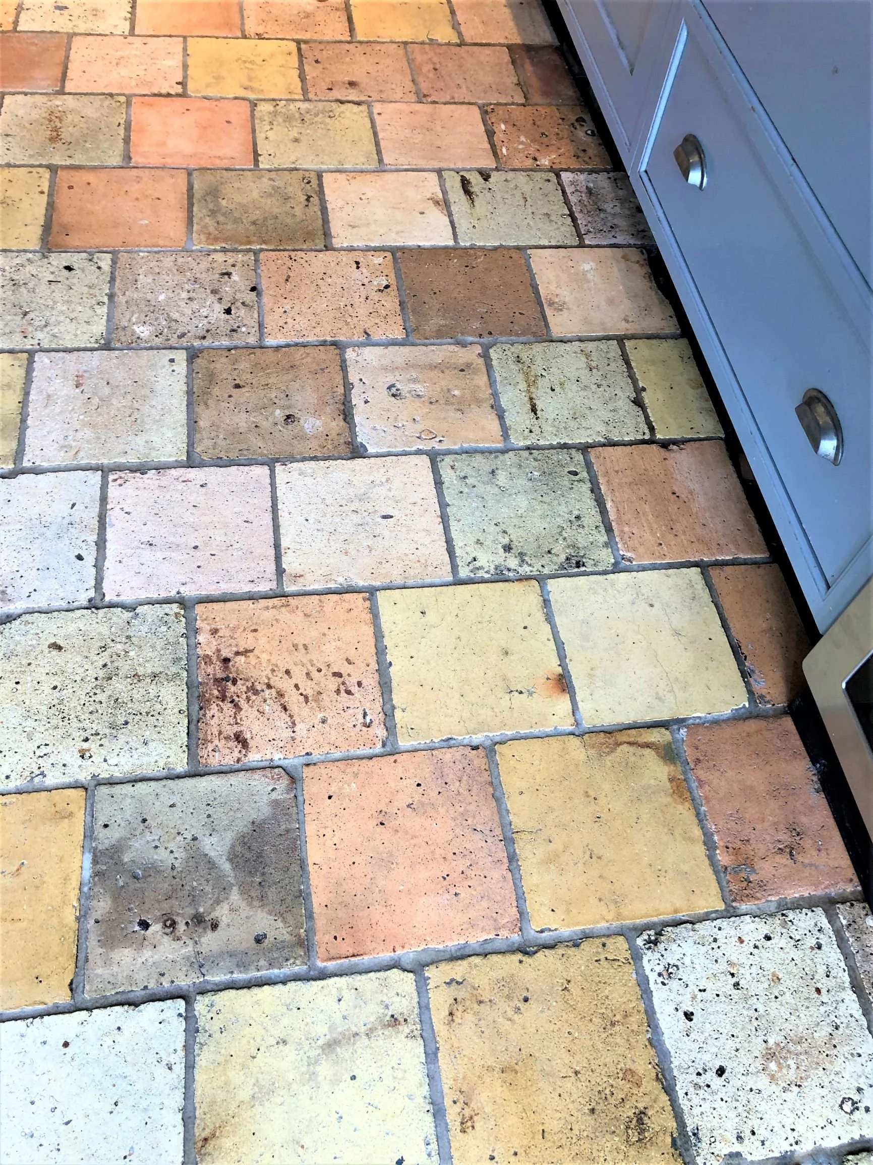 Old Terracotta tiles are rich in colour and have a texture that oozes rustic appeal. One often conjures up an image of an old country cottage floor, with stand alone wooden cabinets and a gleaming old Aga range.