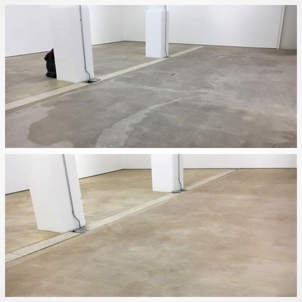 The issue with the concrete flooring of this six hundred square meters former car showroom (below) was caused during a commercial film shoot. When filming was complete in an attempt to clean off the sticky residue from tape, the cleaners hired used the wrong chemicals for concrete and the white patchy effect was the mess they made of the task.