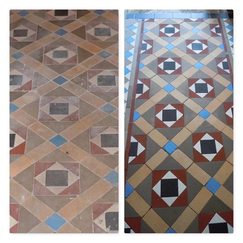 When the surface appears dull and filthy, as in the photo, a tile deep clean should deal with most of the issues; however, some of these aggregates may not be completely removable. A light resurfacing on some types of tiling is possible but should be cautiously undertaken to avoid eradicating colouring and detail.