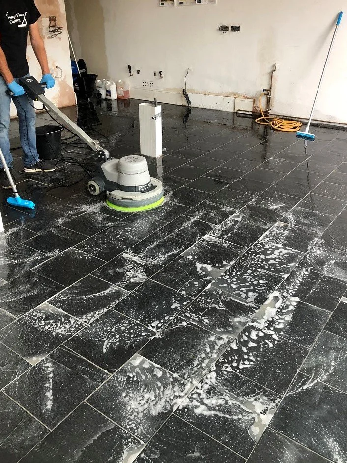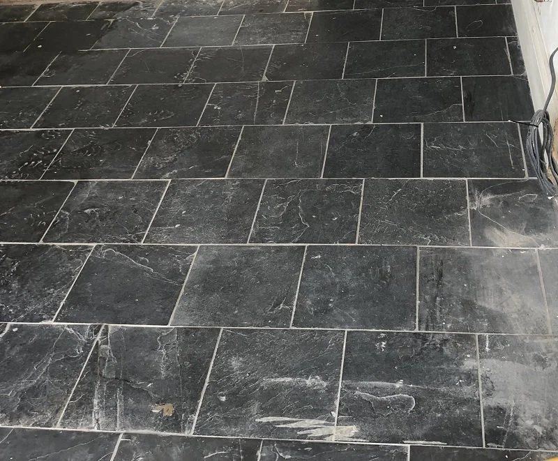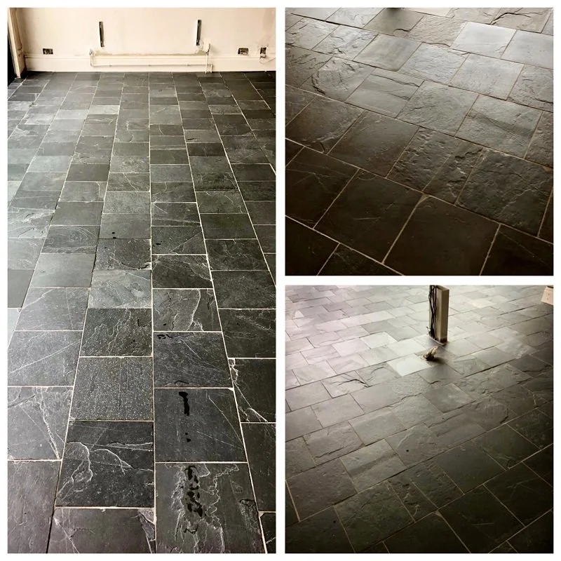 Often during building works slate flooring becomes saturated with a mess. Even with protective measures in place, gypsum dust and cement residue find its way through to contaminate the flooring.
